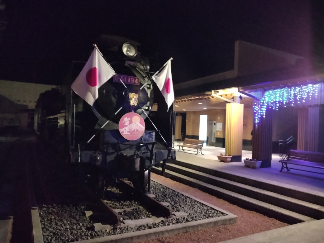 写真は、元朝式に向かう途中でイルミネーションに輝く津和野駅とSLの光景がきれいでしたので撮影いたしました。
